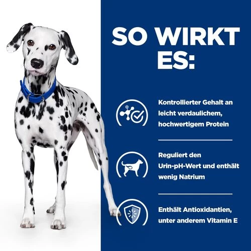 Hill’s Prescription Diet u/d Urinary Care reduziert nachweislich die Bildung von Oxalat-, Urat- und Cystinsteinen. Es enthält nur einen geringen Anteil an hochwertigen Proteinen, um Abbauprodukte, die Unwohlsein beim Patienten mit Nierenversagen hervorrufen, zu reduzieren. Mit seiner reduzierter Salzgehalt zur besseren Kontrolle des Flüssigkeitshaushaltes bei Herzkrankheiten im Anfangsstadium.Hunde, denen u/d Canine dauerhaft gefüttert wird, sollten auf eine mögliche Entwicklung eines Proteinverlusts hin beobachtet werden.