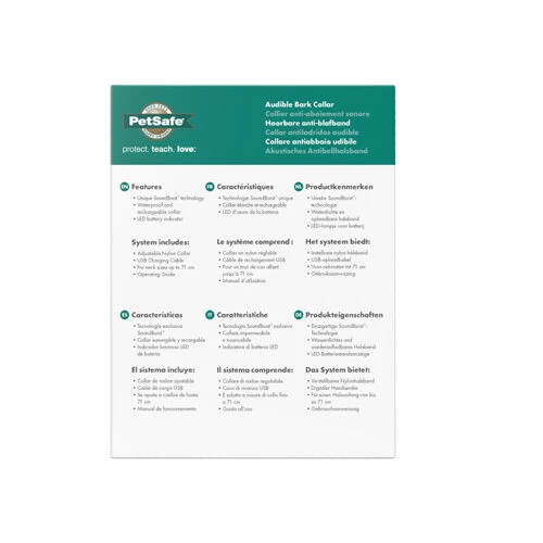 Das Petsafe Anti-Bell-Halsband erkennt Vibrationen und auch Geräusche, um eine akustische Korrektur bei zu viel Bellen zu ermöglichen. Das Geräusch ähnelt dem Sprühen mit einer Spraydose und lenkt den Hund vom Bellen ab. Es gibt 10 Stufen zur automatischen Anpassung der Dauer der akustischen Stimulation. Das Halsband wird nur aktiviert, wenn Ihr Hund bellt, ohne versehentliche Aktivierung. Zusätzlich ist das Halsband wasserdicht und für den Innen- und Außenbereich geeignet. Das Halsband kann mit dem mitgelieferten USB-Ladegerät aufgeladen werden und hält etwa 40 Stunden. Das PetSafe Anti-Bell-Halsband ist für Hunde mit einem Gewicht von über 3,6 kg geeignet.